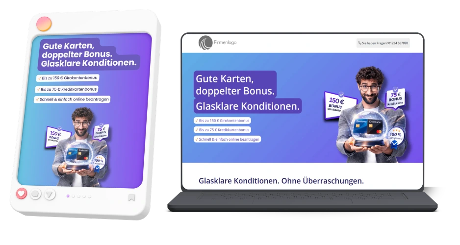 Bei Digidor finden Sie als Partner eine kostenlose Landingpage inklusive Infotexten, sowie fertige Social-Media-Vorlagen und eine E-Mail-Kampagne zu diesem Thema. So binden Sie die das Thema Girokonto & Kreditkarte mit Bonus strukturiert ein und führen Ihre Kunden auf kurzem Weg zum Abschluss.