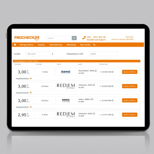 Der europaweite Vergleich zeigt tagesaktuelle Angebote. Der Abschluss gelingt in wenigen Minuten per VideoIdent (IDnow); Kontoführung und Abschluss sind kostenfrei. Ihre Kunden wählen Bank und Laufzeit selbst – Sie greifen Fälligkeiten rechtzeitig auf und bauen bequem Ihr Folgegeschäft auf. Starten Sie den Prozess direkt aus dem CRM oder Ihrer kostenfreien Maklerhomepage und binden den Vergleich als Link oder Widget ein.